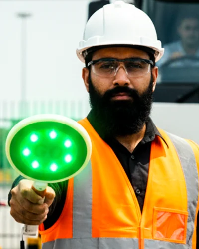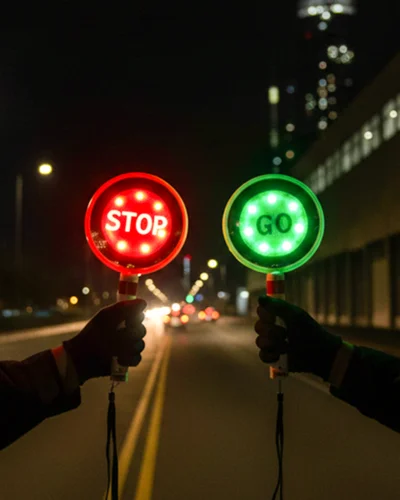A rechargeable LED warning baton with bright red and green lights for traffic management and safety signalling. Built for visibility, durability and ease of use in low-light or emergency environments.