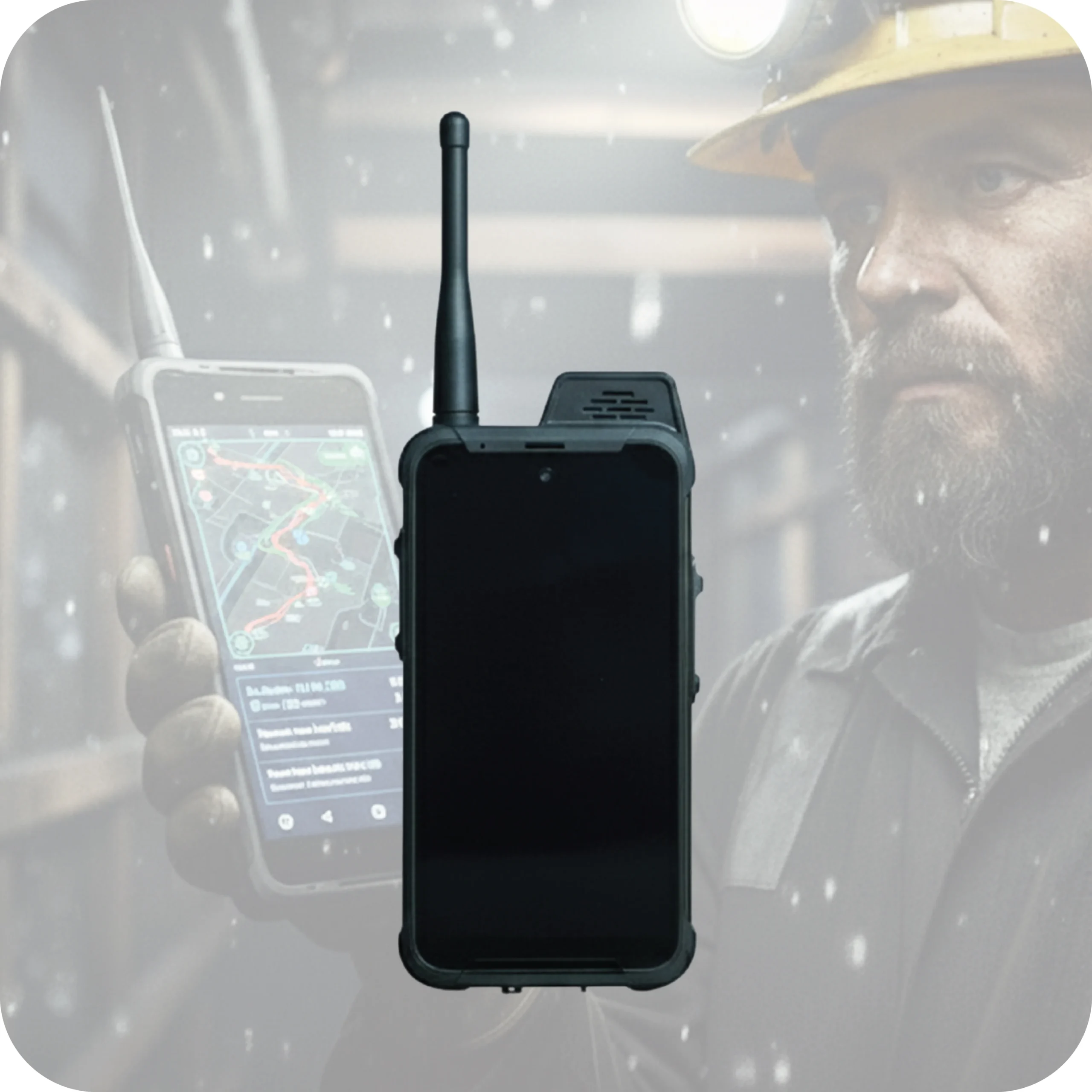 An industrial 5G smartphone with integrated DMR radio for reliable communication in areas with no network coverage.